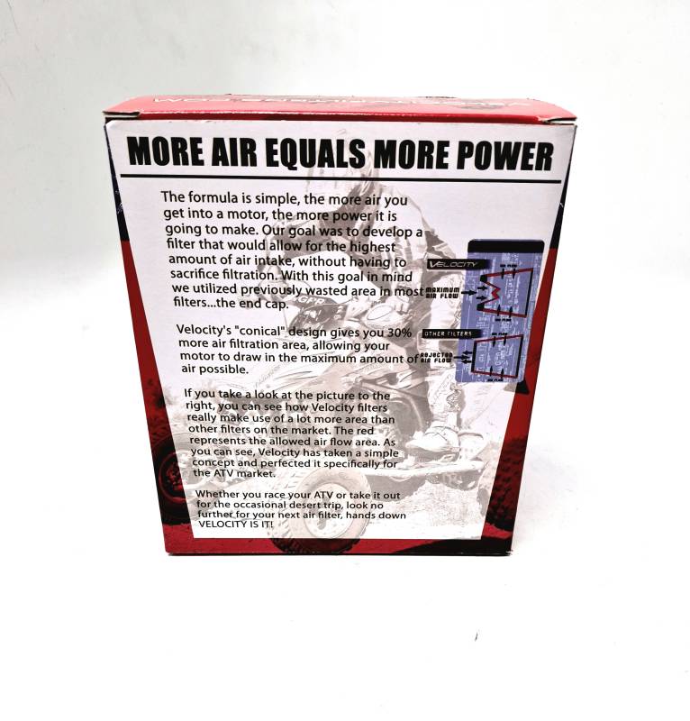 More air equals more power. The formula is simple, the more air you get into a motor, the more power it is going to make. Velocity's goal was to develop a filter that would allow for the highest amount of air intake without having to sacrifice filtration. With this goal in mind, they utilized previously wasted areas in most filters, the end cap.